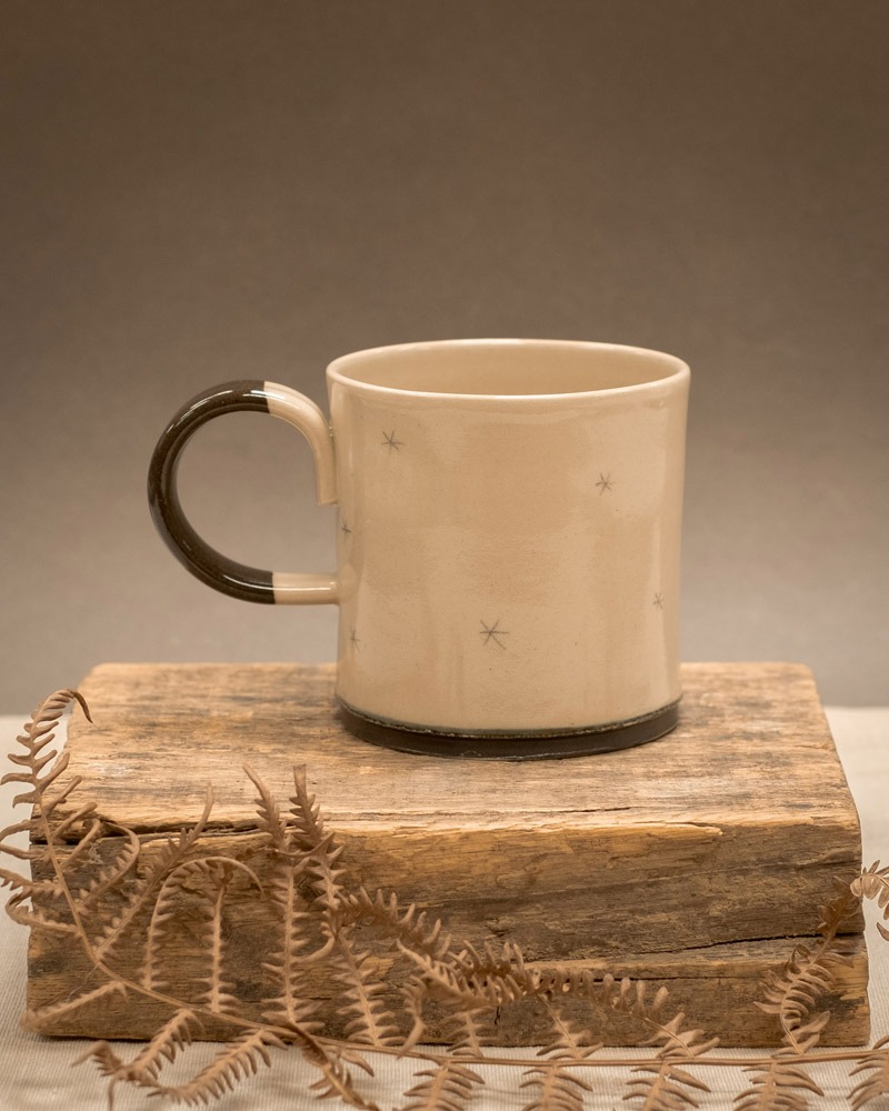This coffee cup, made of white clay, is turned on a potter’s wheel. It has a specially finished dark bottom rim and a brown handle, a warm character and a volume of just around 2,5 dl.