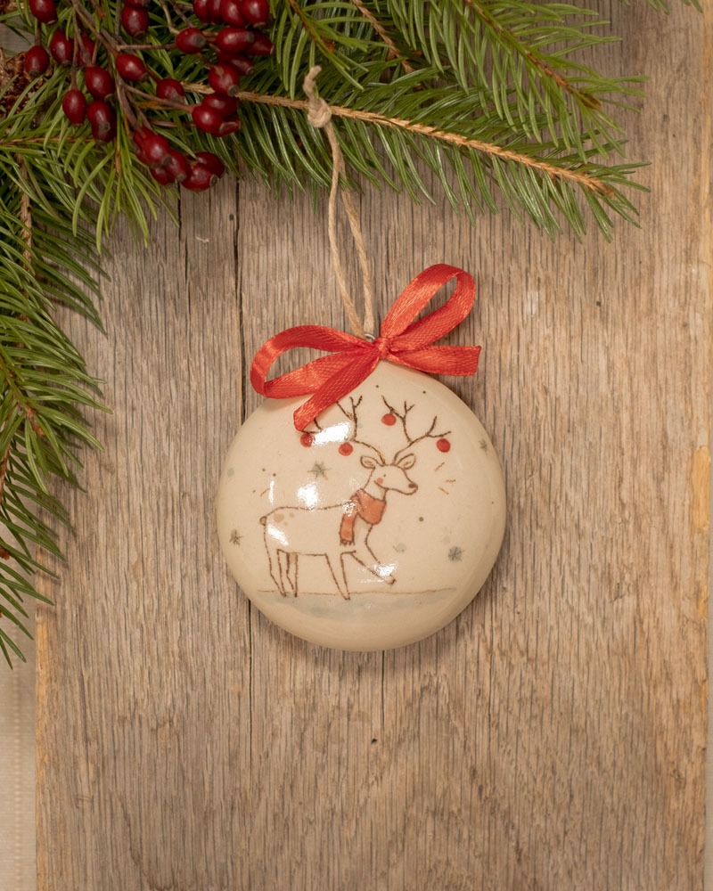 Praznični okrasek, pripravljen za namestitev na smrečico ali darilo. Skrbno izdelan iz glinenih plošč in ročno ilustriran.