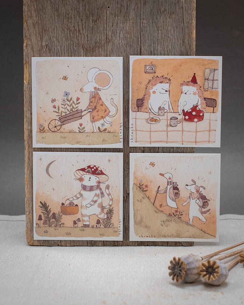 Zbirka štirih priročnih dopisnic shrusko. Za njih si zamišljava več različnih namenov – uporabne so kot voščilnice, dopisnice, posvetilnice, okrasnice in vse kar je še besed, s katerimi lahko opišemo komplet sličic, ki prijetno sedejo v dlan. Primerne tudi kot okras na steni. Komplet štirih sličic v velikosti 8×8 cm.