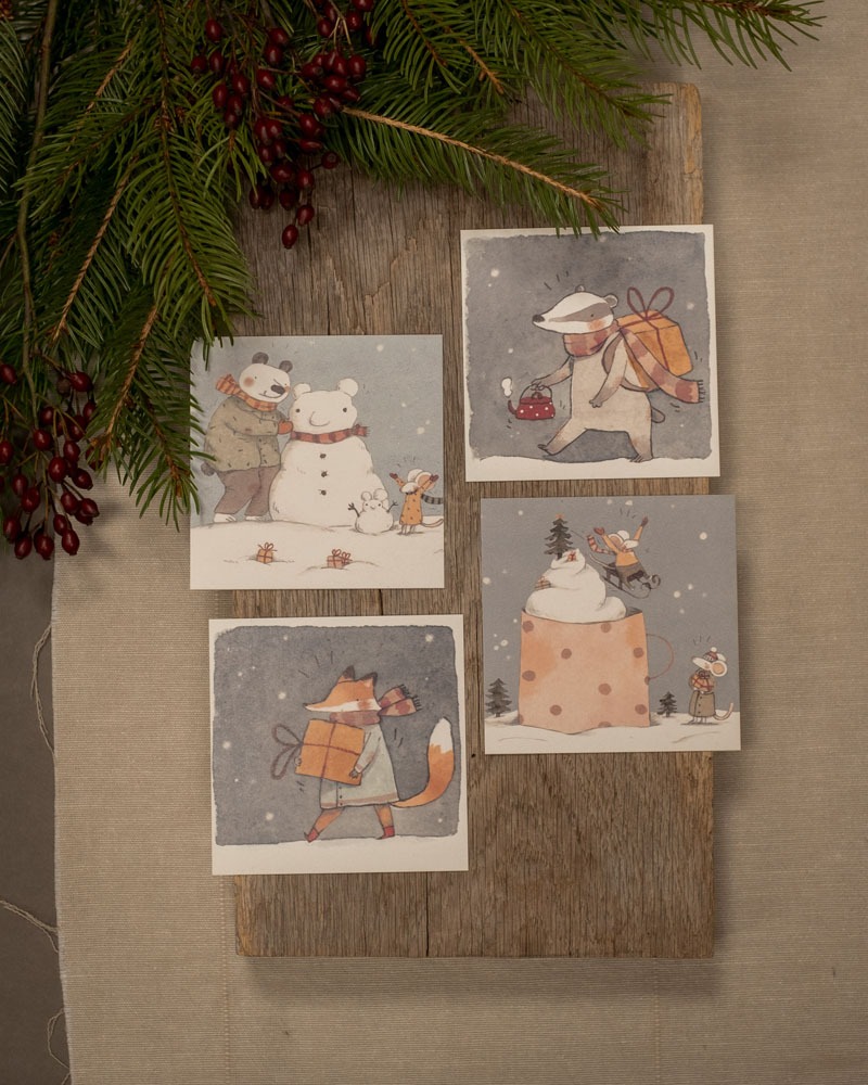 Posebna izdaja štirih priročnih dopisnic z mnogimi uporabami – kot voščilnice, dopisnice, posvetilnice, okrasnice in vse kar je še besed, s katerimi lahko opišemo komplet sličic, ki prijetno sedejo v dlan. Primerne tudi kot okras na steni. Komplet štirih sličic v velikosti 8×8 cm.