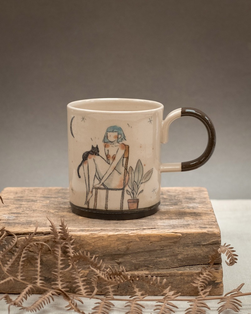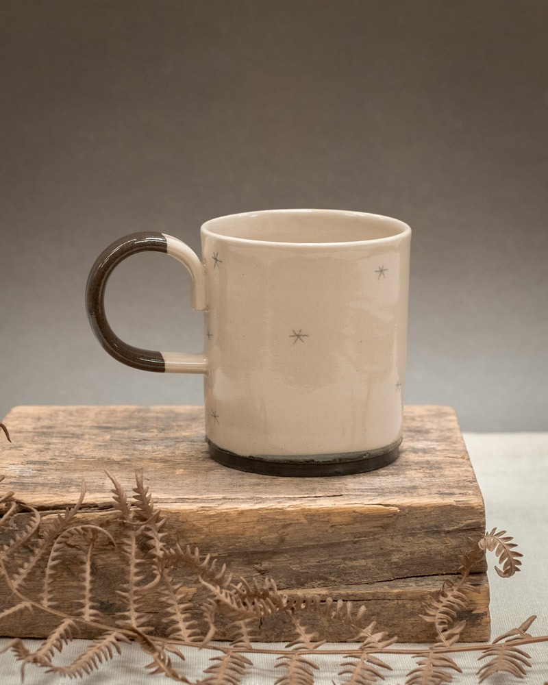 Kavna skodelica je nastala na lončarskem vretenu iz bele gline. Ima temno engobiran spodnji rob in rjavo ročko, ščepec gole kože in topel značaj. Njena prostornina je približno 2,5 dcl.