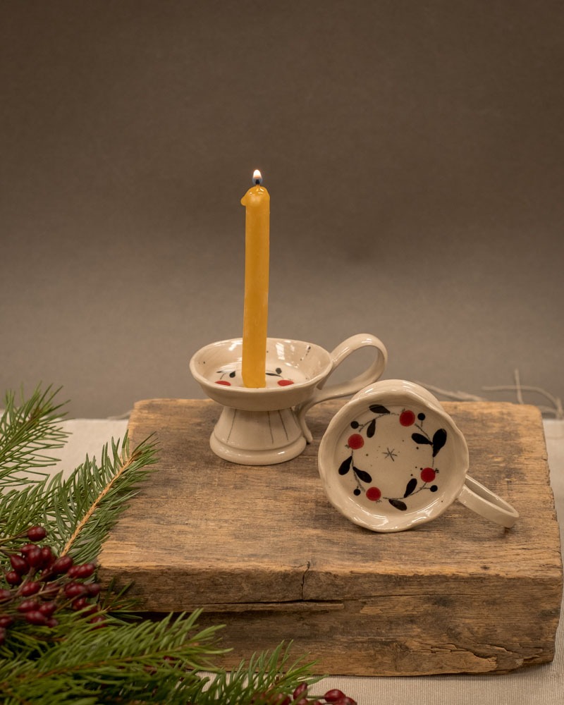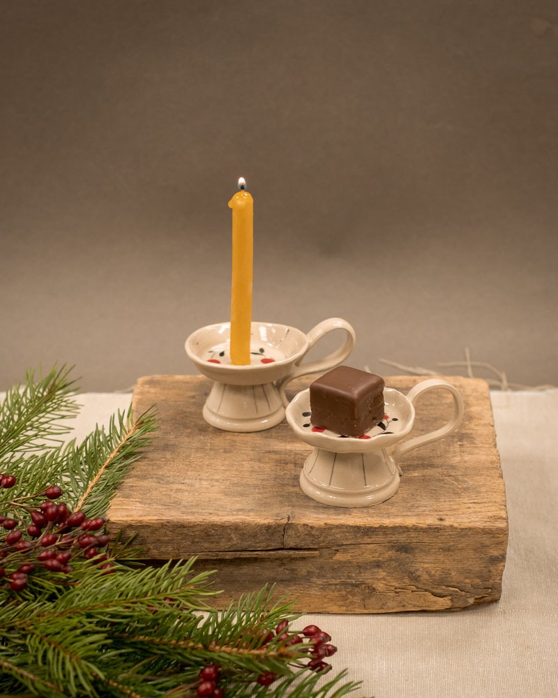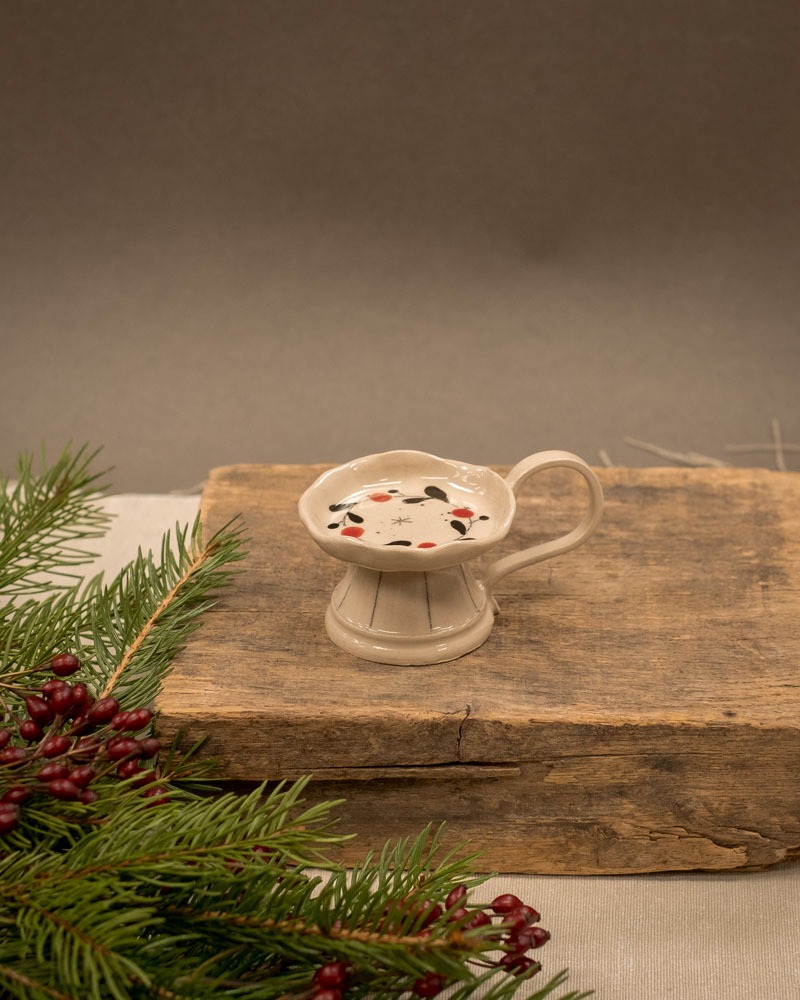 Mali svečnik shrusko, primeren za sveče s premerom do 45 mm. Eleganten ročaj in stabilen podstavek. Če imate dober smisel za humor, lahko na njem gostu ponudite piškot – priporočava, da ima tudi gost dober smisel za humor.
